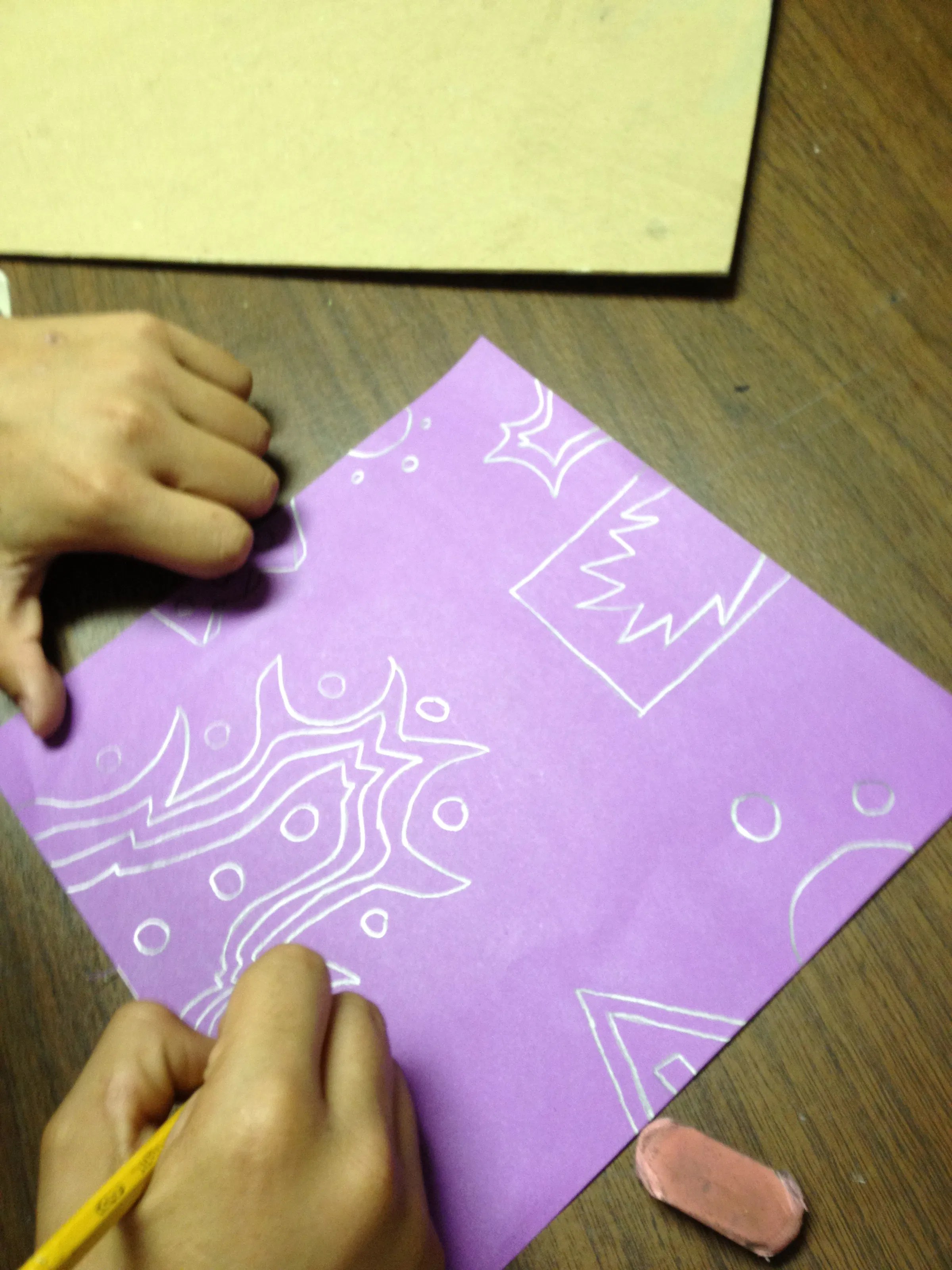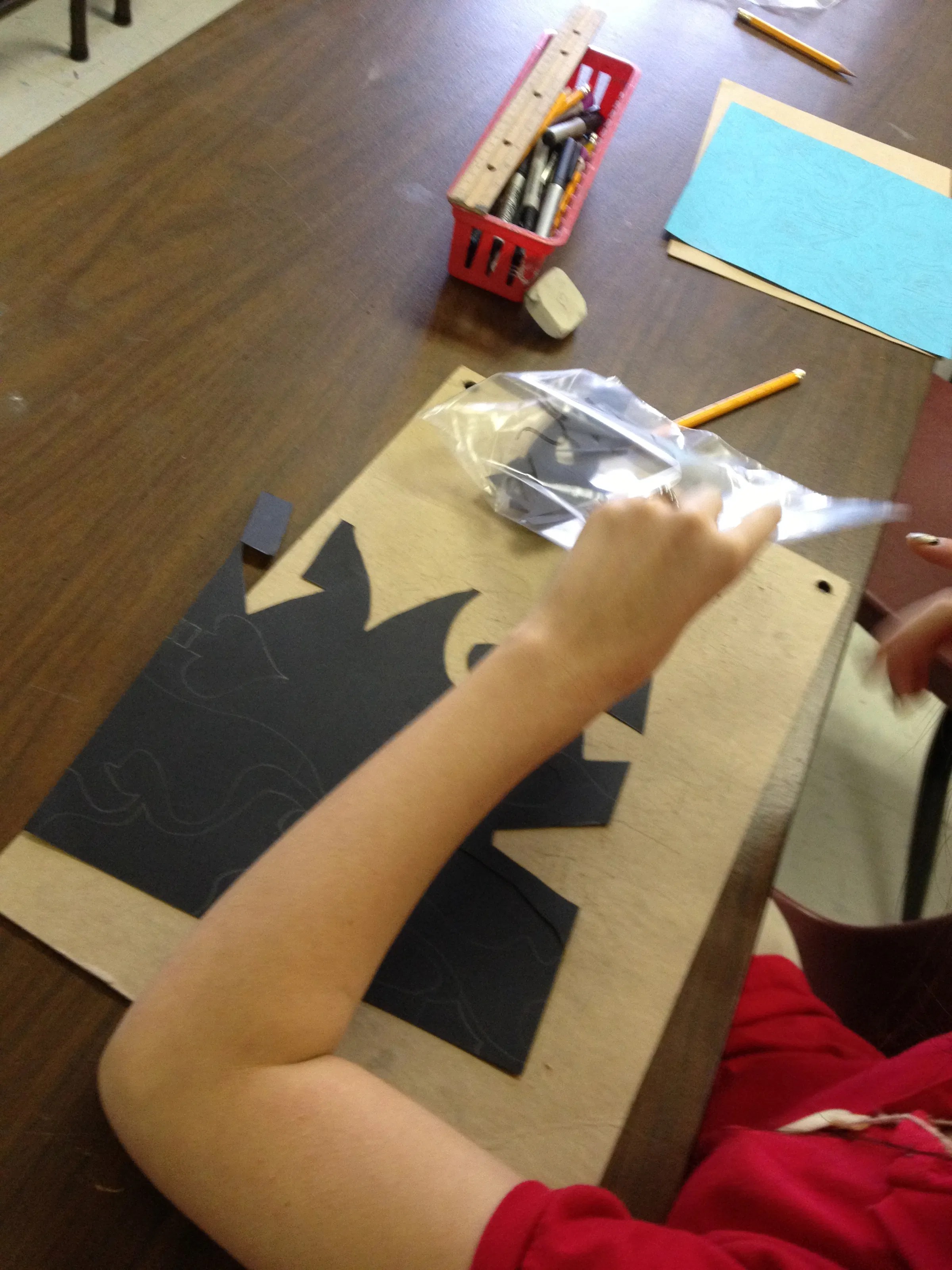 MATERIALS: 9×12 Construction paper or 10″ Dual Side Embo Construction Paper 10 Colors 100 Sheets , 18×24 white, black or colored paper, Exacto Knives, cutting boards, glue sticks